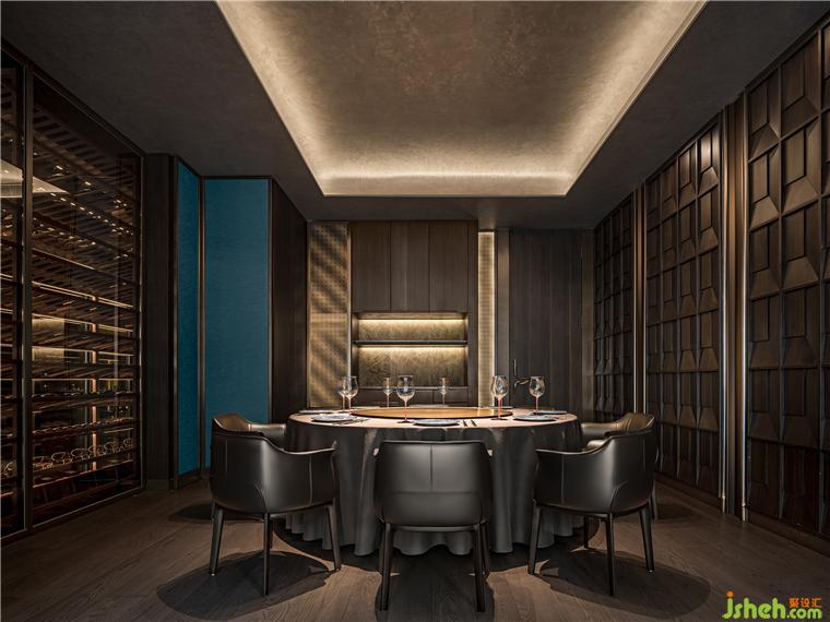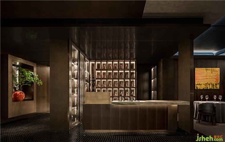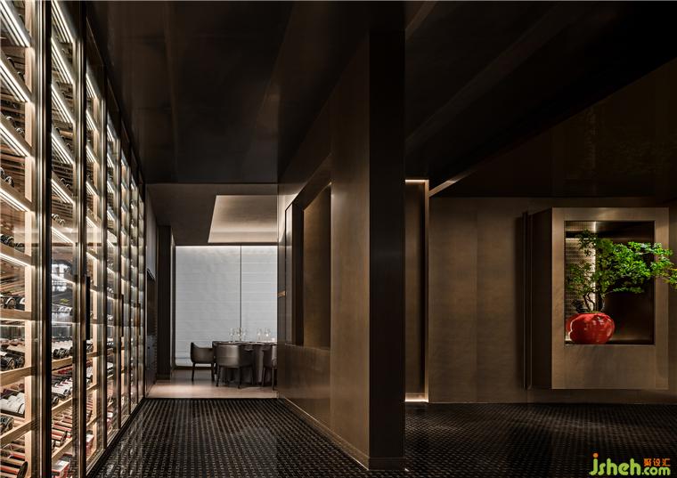 酒柜運用燈帶、玻璃材質(zhì)的組合,在排列上構(gòu)成環(huán)境的聚攏和緊湊感,而鏡面亦深化空間縱深,一來一回,空間張力呼之欲出。