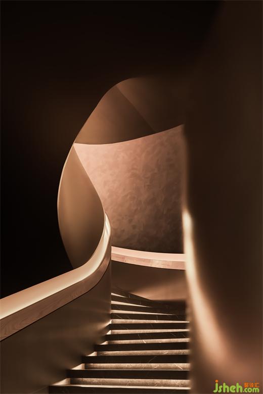 曲線(xiàn)的點(diǎn)綴柔化了整體氛圍,讓金屬感的雅致空間多了一絲懸念和儀式感。拾級(jí)而上,每個(gè)角度都可以獲得別樣的意趣。