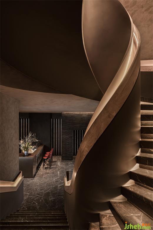 如“爐火”般溫?zé)岬囊曈X(jué)體驗(yàn),高貴典雅的材質(zhì)氛圍,讓心靈回到舒適的溫度。項(xiàng)目上下兩層空間通過(guò)一個(gè)極具藝術(shù)感的旋轉(zhuǎn)樓梯連接。