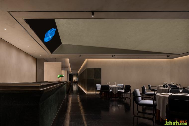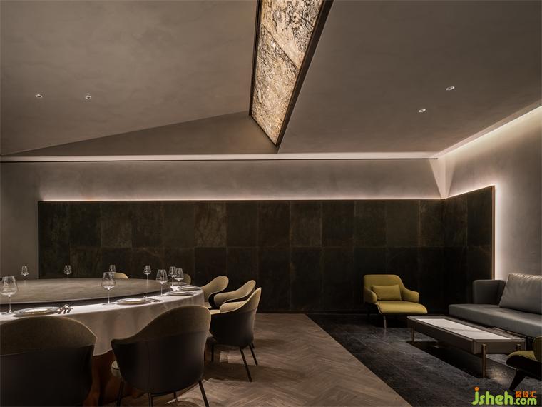 詩人居廉寫道:“月在荔枝樹上,人行茉莉香中”,表達(dá)自己的愉悅心情。餐廳設(shè)計通過頂部空間的形態(tài)與色彩的變化,進(jìn)一步加強(qiáng)空間的色彩與明暗對比,強(qiáng)化游走意趣。