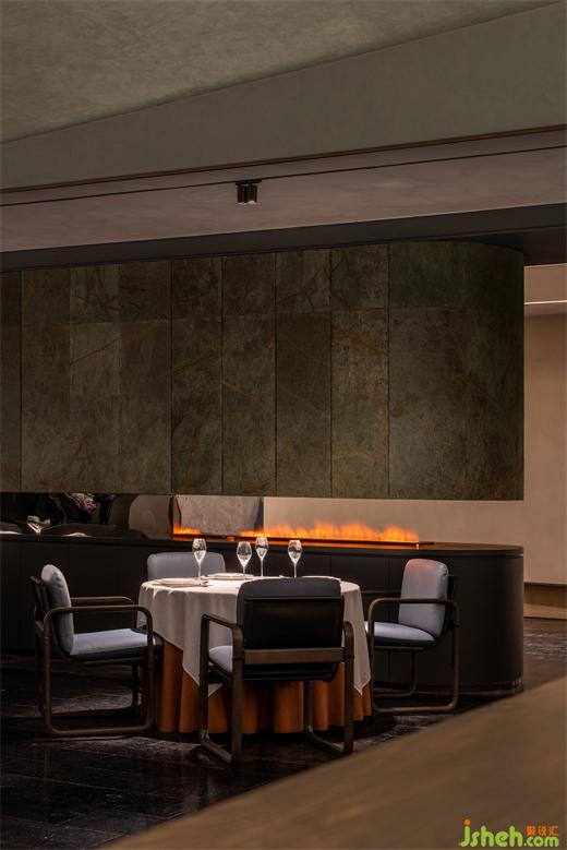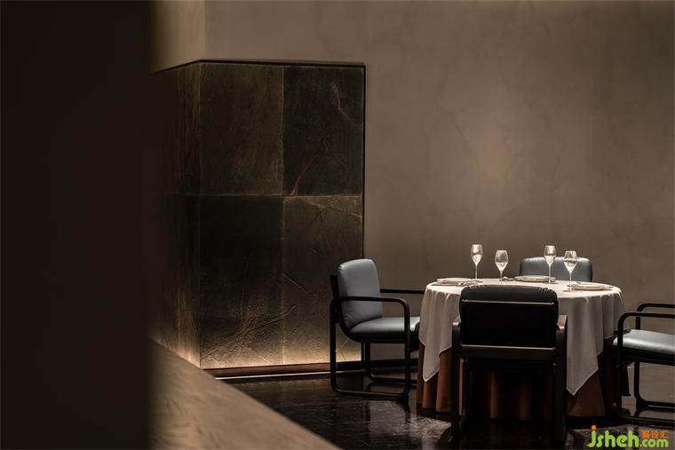 桌椅、地面采用的灰藍色系的顏色搭配,使得整個空間內(nèi)散發(fā)出一種典雅流暢的氣息。柔和的燈光灑向整個空間,給予圍坐而談的人們充分的私密感與安全感。