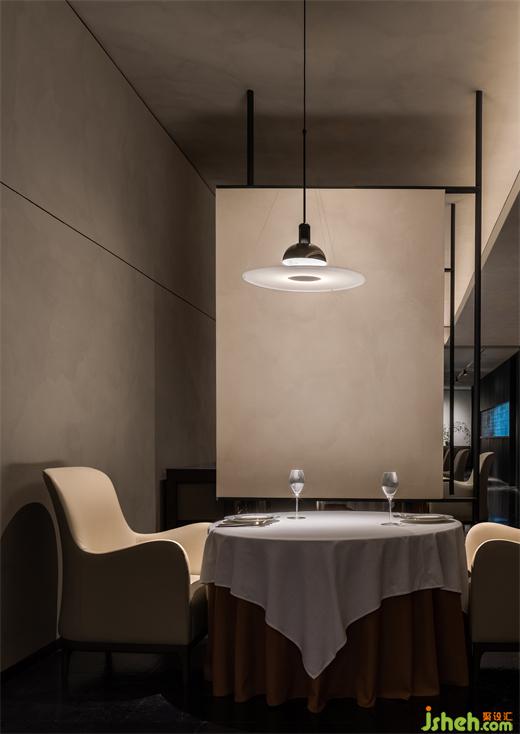 屋頂局部點綴的燈光,在照亮空間的框架結(jié)構(gòu)的基礎(chǔ)上,照亮餐桌本身,營造出良好的就餐氛圍,也將空間主角還給餐桌上的美食,如同茉莉花語,本真誠摯。