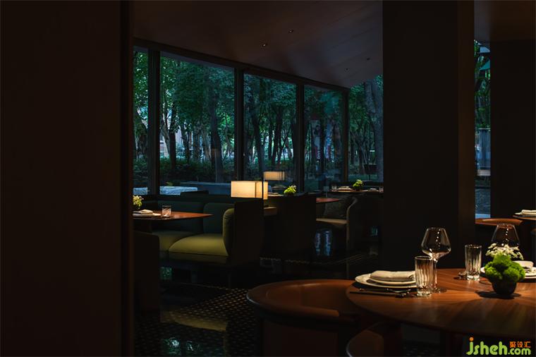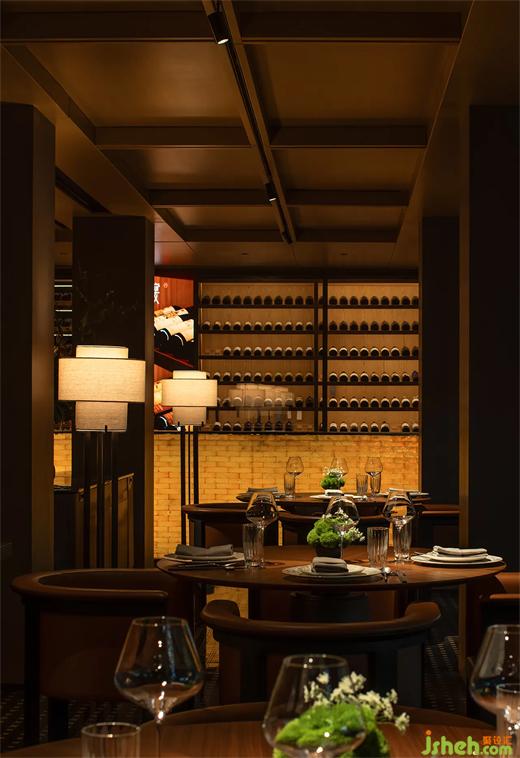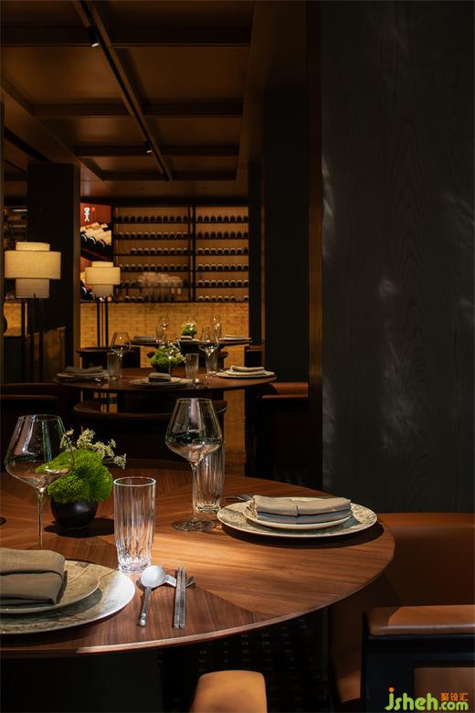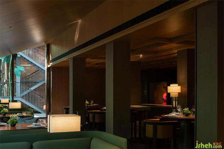 餐廳設(shè)計(jì)以質(zhì)樸青綠作為主角基調(diào),搭配朱紅色的大面積布藝墻面,整體氛圍營造出一種古樸雅致的東方意味。入口處青黑色大理石鋪就的地面與朱砂紅墻面形成強(qiáng)烈對比,引人入勝,兩種反差極強(qiáng)的色彩大面積的展開,大膽而毫不掩飾的展示整個(gè)中華文化中雍容,大方的精神氣韻。