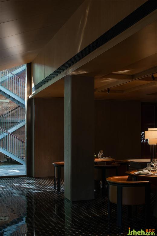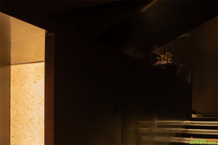 由青灰石材鋪就的樓梯步入二層,接待處延續(xù)了矩形的設(shè)計(jì)語言,更加清晰的軸線布局運(yùn)用到空間中,餐廳設(shè)計(jì)以走廊分割功能空間,每個(gè)包廂獨(dú)立而又貫通,脈絡(luò)清晰的線性格局述說武漢古往今來的生活圖景。
