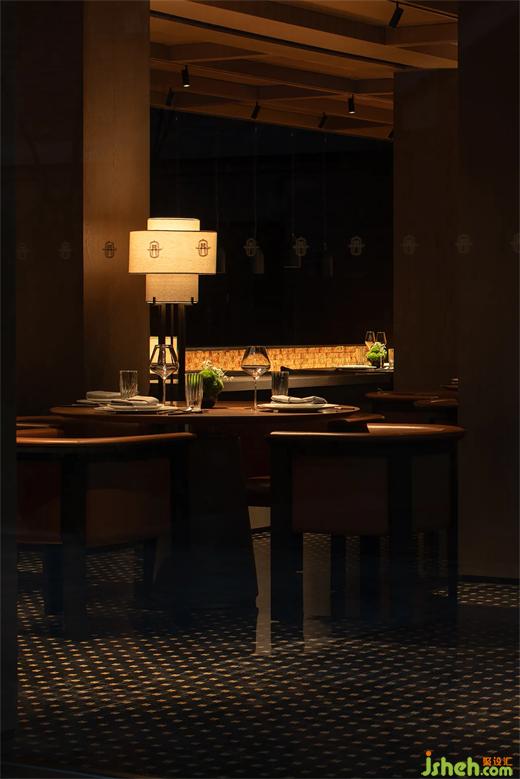 步入前廳,整齊排列的語言形式解讀了設(shè)計(jì)中對于禮制形制的破除與重構(gòu):依照軸線排列的序列性→豎向圓柱體塊的運(yùn)用,在打破中構(gòu)建新的秩序,追求空間形式中的和而不同。在燈具的選擇上,也選取了多種類宮燈造型的品類,與空間中的古意和韻而唱。
