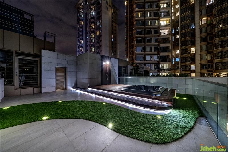 于主人房外的樓梯拾級(jí)而上到達(dá)天臺(tái),設(shè)計(jì)師為維持整個(gè)家的一體感,天臺(tái)用色和花園十分相似,一樣以石地板配搭綠草和木地臺(tái)。不同的是,為響應(yīng)天臺(tái)按摩浴池的主題,設(shè)計(jì)師將草地鋪蓋成流線形,悠閑有特色。