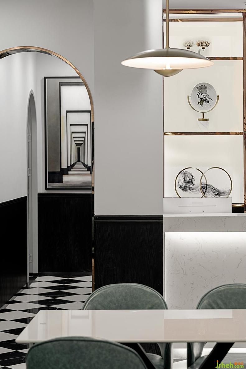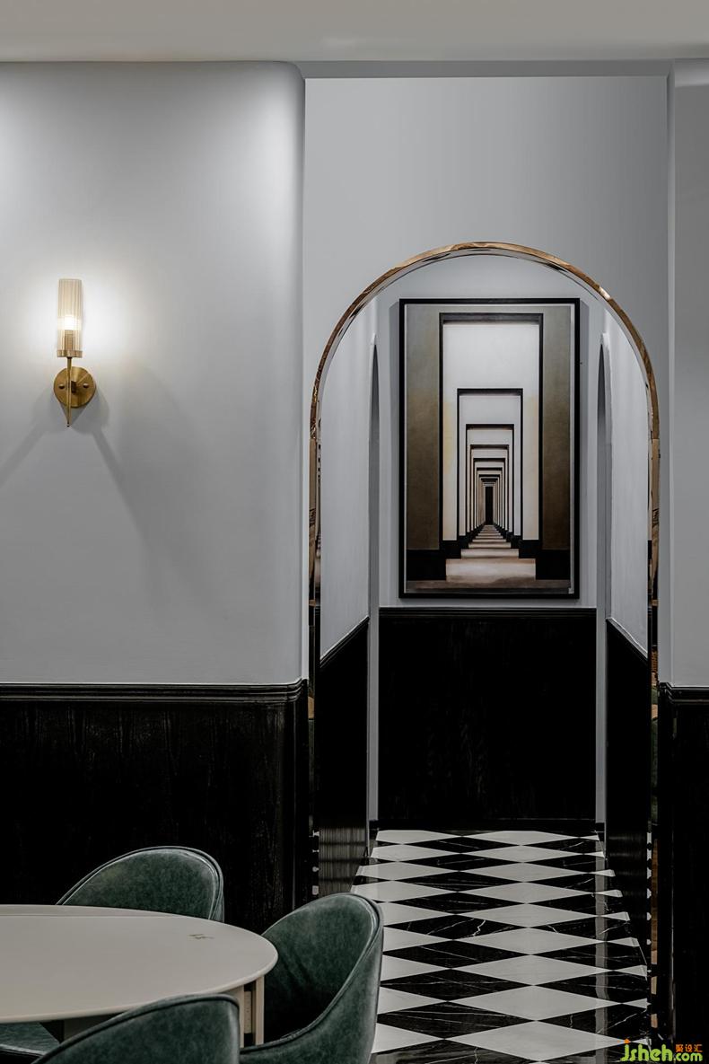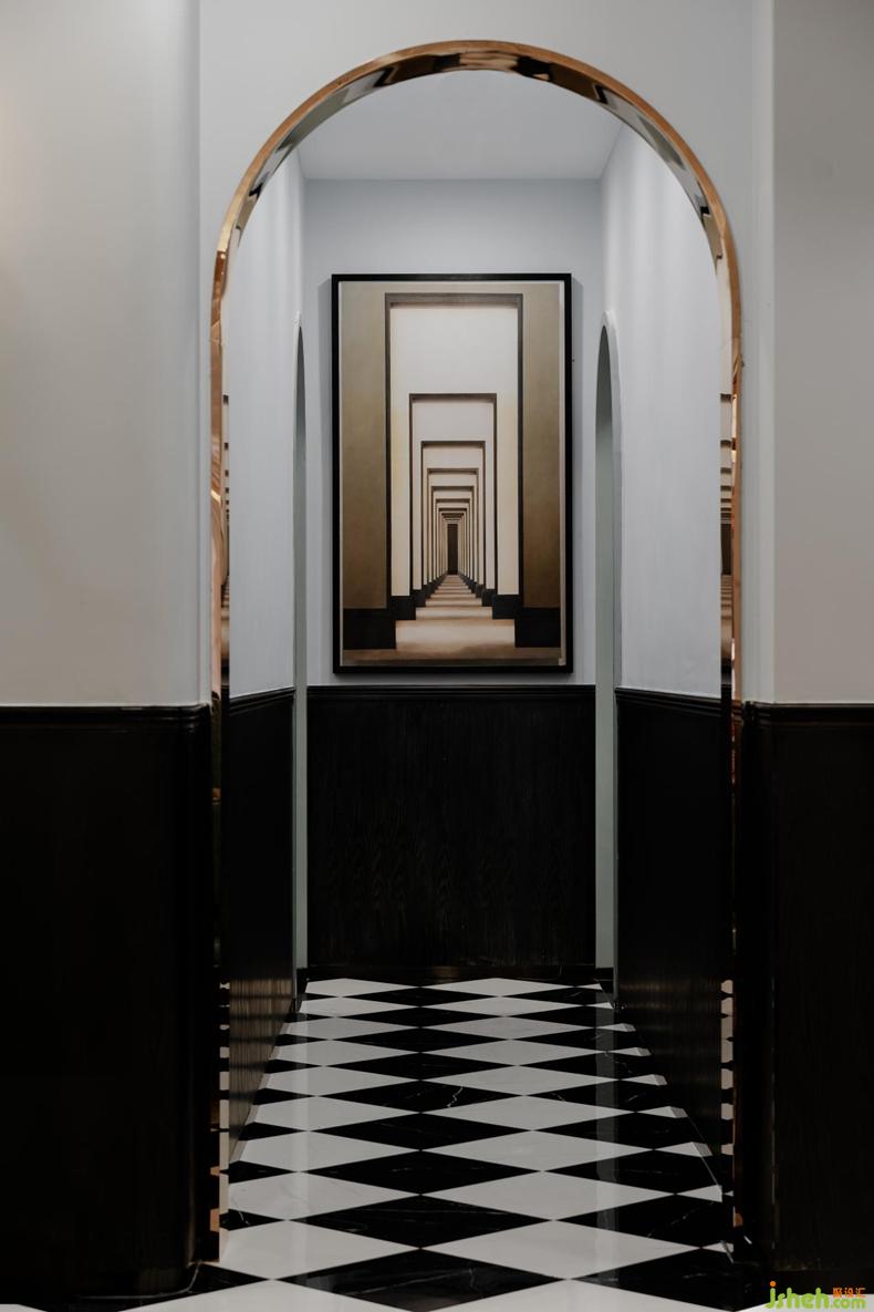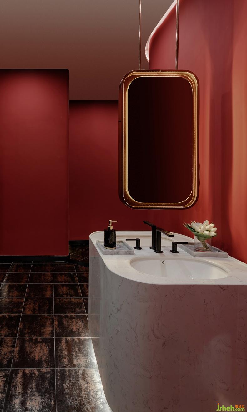 沿著過(guò)道繼續(xù)往前走,設(shè)計(jì)師在這里打造了一個(gè)別具一格的衛(wèi)生間,鮮艷的紅色,同時(shí)與外面的白色和黑色形成了強(qiáng)烈的色彩碰撞,深圳餐廳設(shè)計(jì)充滿了激情和活力,激發(fā)無(wú)限的想象力與視覺感受。