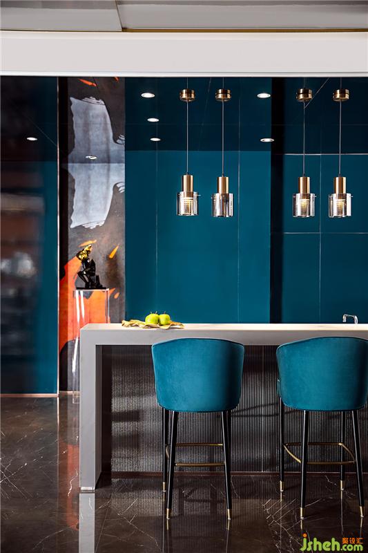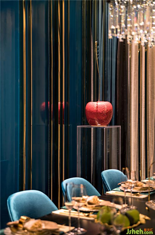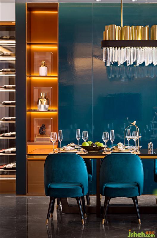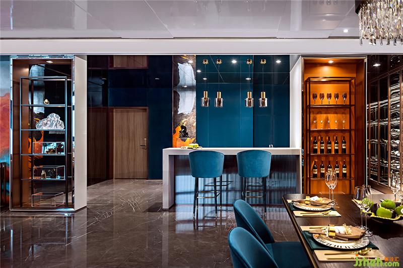 整個(gè)會(huì)所空間以藍(lán)、金主色調(diào)為主,出挑的造型設(shè)計(jì)精心演繹著當(dāng)代的輕奢時(shí)代生活。在整體深色基調(diào)中通過細(xì)膩的質(zhì)感和色彩上的對比,玻璃與金屬的運(yùn)用,表現(xiàn)出空間的品質(zhì)感??臻g嚴(yán)謹(jǐn)?shù)闹剖?,地面古堡灰大理石,加入濃烈大膽的美人蕉橙和?nèi)斂的搪瓷藍(lán)沖突碰撞,營造極致的視覺體驗(yàn)和極具張力的空間感受,如葡萄酒般濃烈、熱情、優(yōu)雅、浪漫、精致、排場,生動(dòng)巧妙地并置。而藝術(shù)畫的點(diǎn)綴更進(jìn)一步增強(qiáng)了空間的時(shí)尚感與藝術(shù)感。會(huì)所設(shè)計(jì)