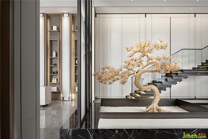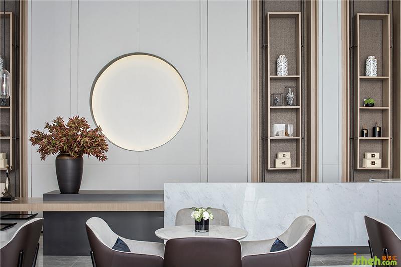 在VIP洽談區(qū),圍合式山水屏風造景區(qū)和樓梯下的造景區(qū),同樣采用了枯山水的造景手法,以近于「空無」的枯淡靜寂,呼應(yīng)室外風景,給室內(nèi)增添一絲詩意的趣味。會所設(shè)計