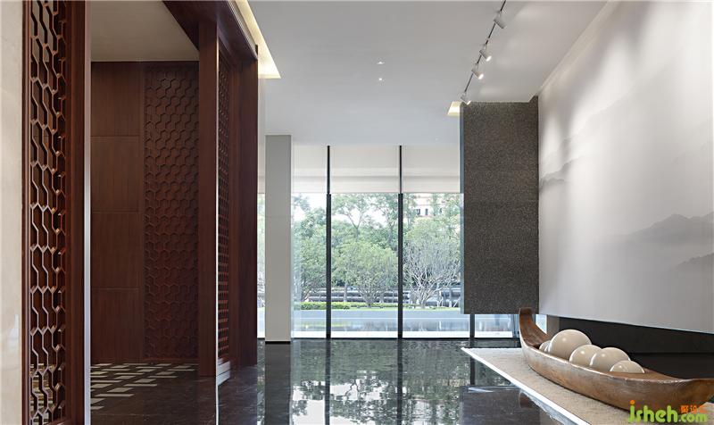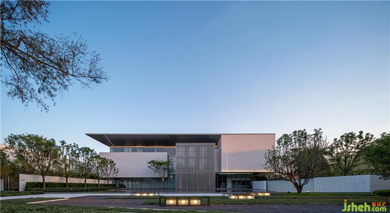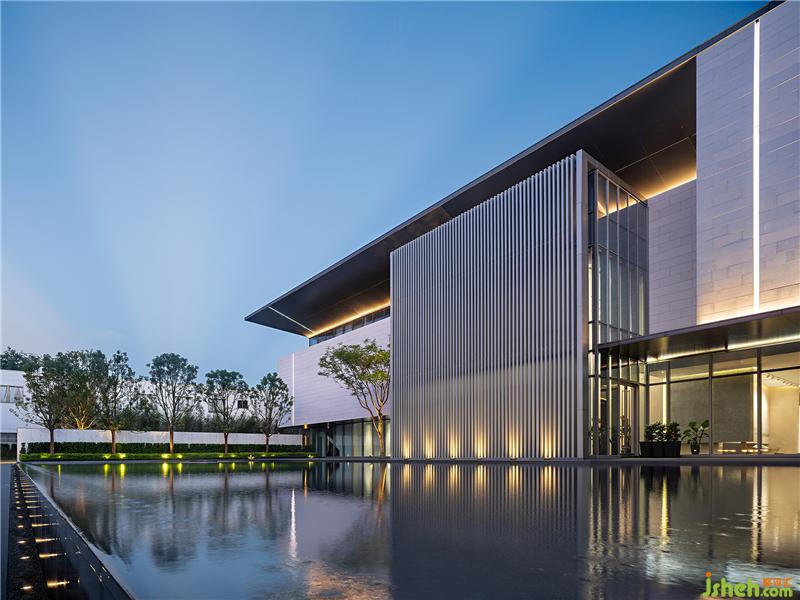 結合水鄉(xiāng)的特色,展示中心入口處設置了一池鏡面水景,建筑倒影在水面上,與周圍環(huán)境融為一體,打造出唯美的水鄉(xiāng)意境。