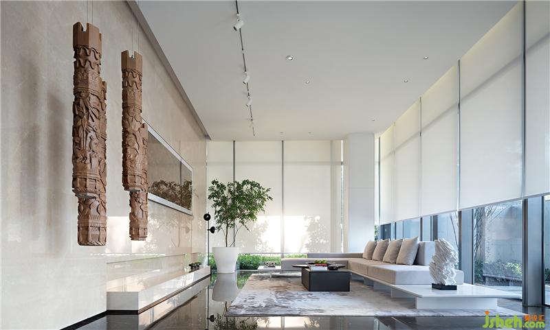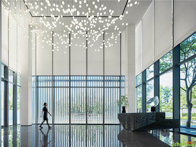 建筑內(nèi)部空間以極簡的白色、淺灰色和自然的木作棕為基調(diào),搭配色彩層次鮮明的黑白灰陳設,再以綠色裝飾作為點綴,使空間所要表達的情緒有節(jié)奏有韻律地鋪陳開來。大面積的落地玻璃,使室內(nèi)得以鄰借室外的自然之景,營造開闊大氣的視覺美感。天然的原石接待臺,為空間注入更多自然生態(tài)的氣息與張力。展示中心設計