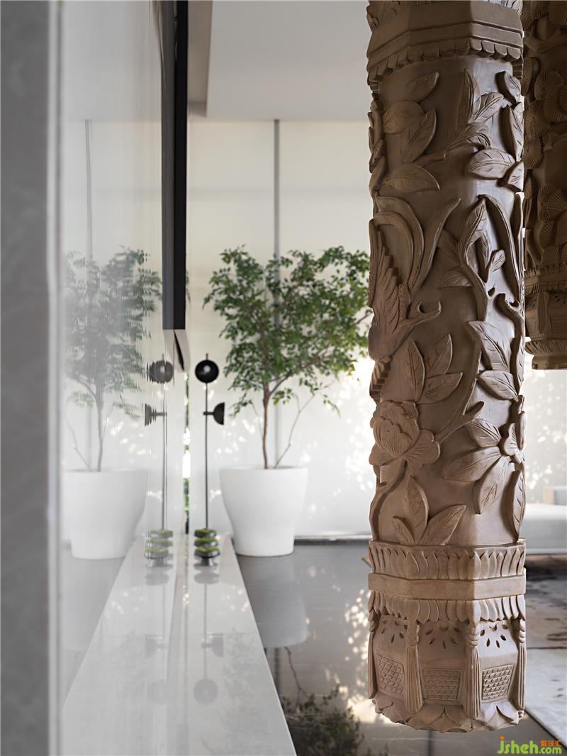 香云紗也是嶺南一個非常有特色的文化元素,被譽為“嶺南瑰寶”,是嶺南非物質(zhì)文化遺產(chǎn)。而獨具地域特色、自成一派的嶺南建筑,則承載著東涌厚重的歷史和記憶,是嶺南文化的靈魂所在。在一層休閑區(qū)的軟裝設計上,設計師將香云紗、嶺南建筑這兩個極具代表性的民族元素分別制作成香云紗裝飾畫和懸吊的建筑木雕,構成了空間的視覺焦點,增強了空間的藝術氣息和地域文化特色。