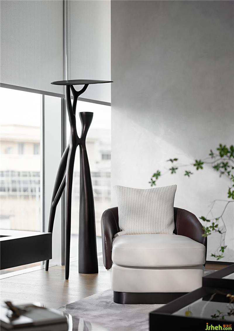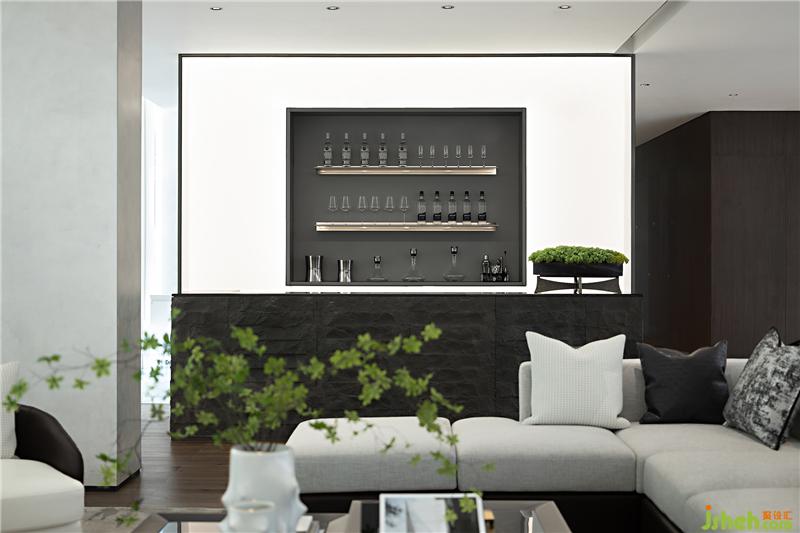 與一層接待臺(tái)相呼應(yīng),二層水吧臺(tái)同樣運(yùn)用了天然的原石材質(zhì),粗狂的石材與空間的白色基調(diào)及精致細(xì)膩的珠寶元素形成強(qiáng)烈對(duì)比,增加了空間豐富的層次和內(nèi)涵。吧臺(tái)上綠植的點(diǎn)綴,讓整個(gè)空間更加的靈動(dòng)和諧。