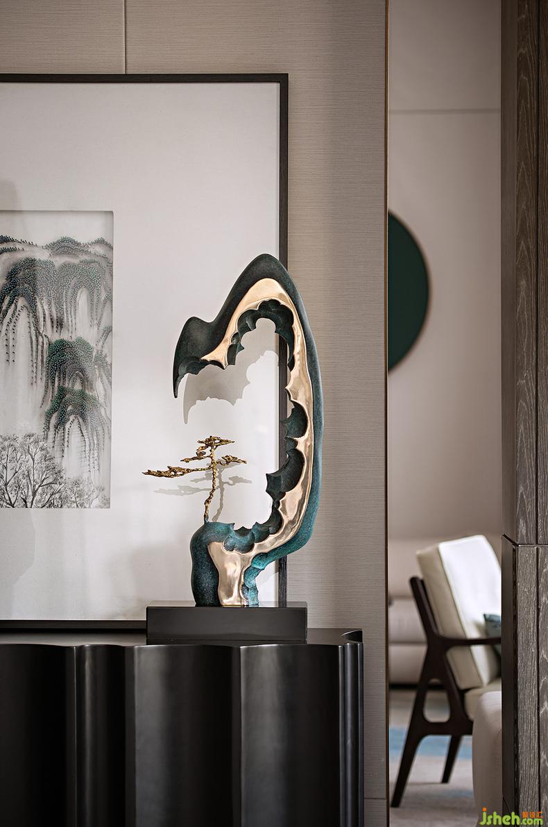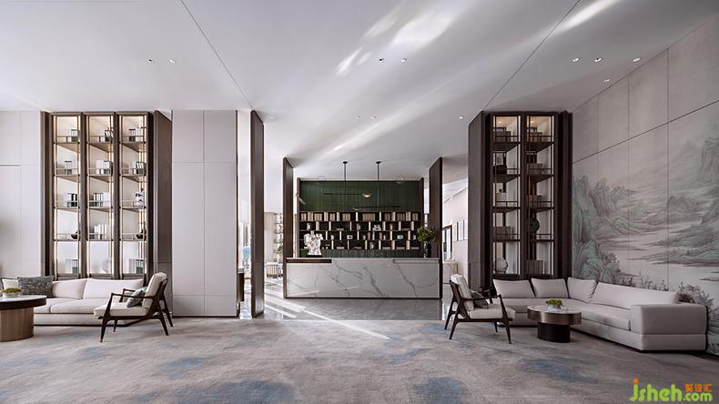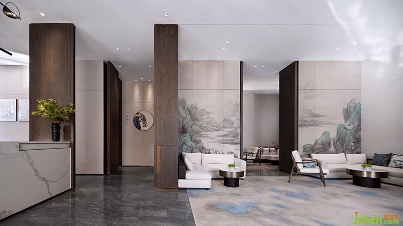 洽談區(qū)延續(xù)了營銷中心靜逸儒雅的風格,銷售中心設計空間的色彩搭配溯源中國古代的山水畫,遠山如黛,江水澄藍,大面積的留白如同畫布,靛青黛藍描摹出清秀淡雅、超凡脫俗的意境。中國傳統(tǒng)配色結合現(xiàn)代極簡的表現(xiàn)手法,讓空間整體呈現(xiàn)出東方美學獨有的風韻。