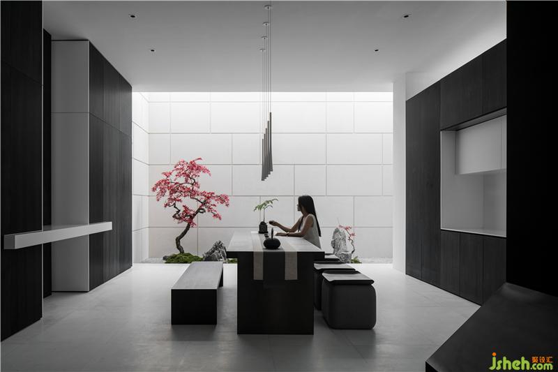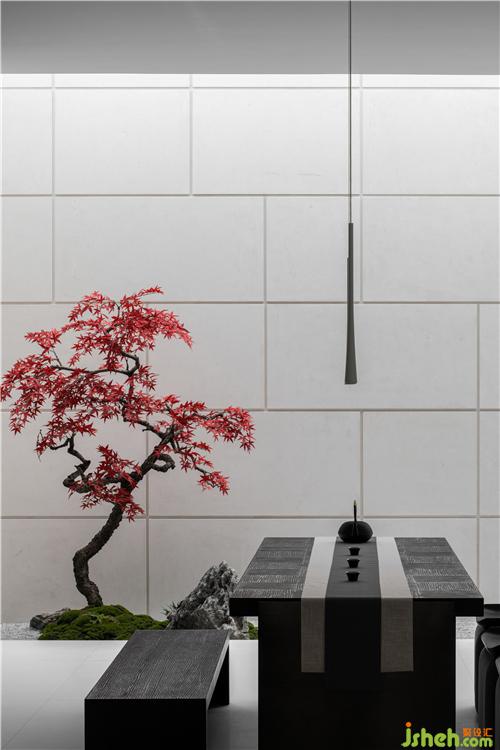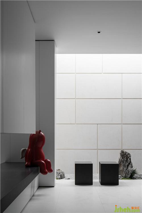西側(cè)的天窗灑下來一束自然光源,地面結(jié)合天花做了,內(nèi)景觀枯山水,把自然光景觀引入室內(nèi),拉近了空間與自然的關(guān)系。在這里,光線散落于空間中,包裹出一個(gè)敏感的空間,一種微小、獨(dú)特的分子隨著光線散落在空間之中,房屋的情緒被細(xì)致地調(diào)動(dòng)起來。