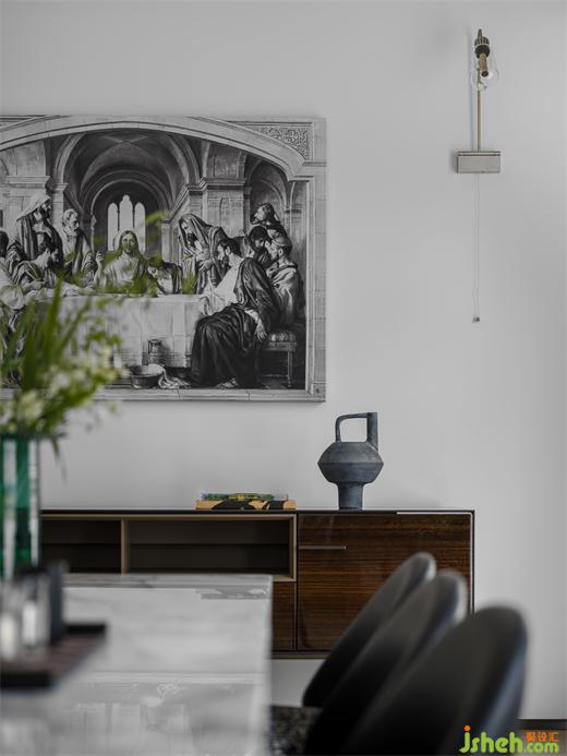 餐廳的邊柜是光面的木制材質(zhì),其上擺放著先秦樣式的的煮茶器具,仿佛是陳列在博物館的藏品,有著陳舊和故事感。別墅裝飾墻上的拉繩開關(guān)電燈泡形狀的壁燈喚起了人們兒時(shí)的回憶,一瞬間時(shí)空恍惚,仿佛回到了幼時(shí)無憂無慮,自由自在的溫暖時(shí)光。屋主信奉天主教,墻上掛著《最后的晚餐》畫作,中西交融,意境悠遠(yuǎn)。