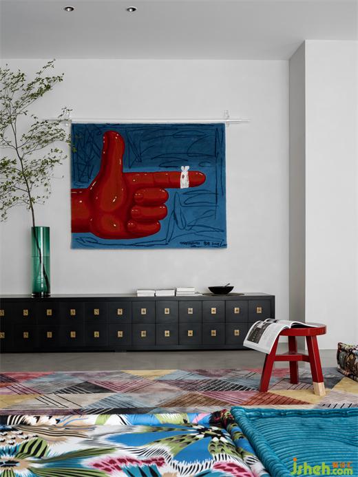 高飽和度的幾何圖形掛畫,墨綠色的沙發(fā),紅色的可愛兔子座椅,莫蘭蒂色地毯,別墅裝飾使靜態(tài)的極簡之家充滿靈動的藝術時尚感。
