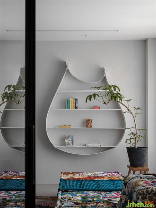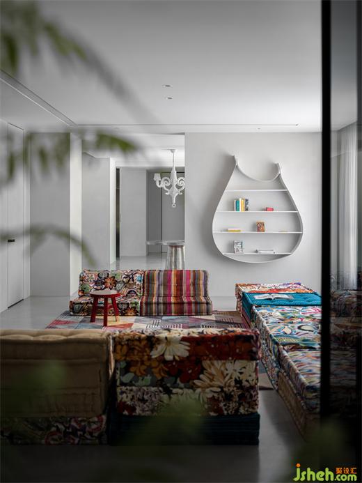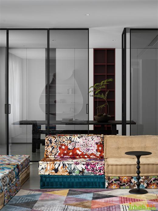 別墅裝飾二樓客廳選擇了意大利產,由泰國設計師Hans Hopfer設計的可自由組合的”麻將“,你可以把”麻將“并成一組沙發(fā),坐在上面喝個下午茶,亦可以把它平鋪作為一張床,睡個午覺。沙發(fā)布料的材質花色靈感來源于日本和服,將多元文化融合的概念體現(xiàn)得淋漓盡致。