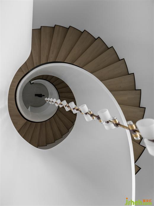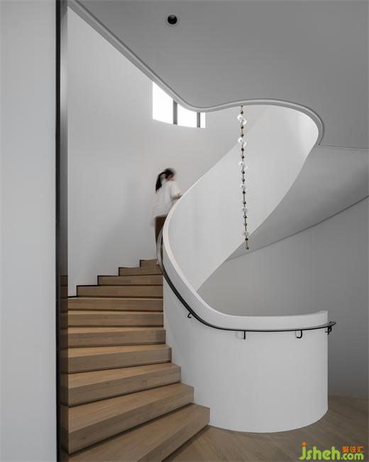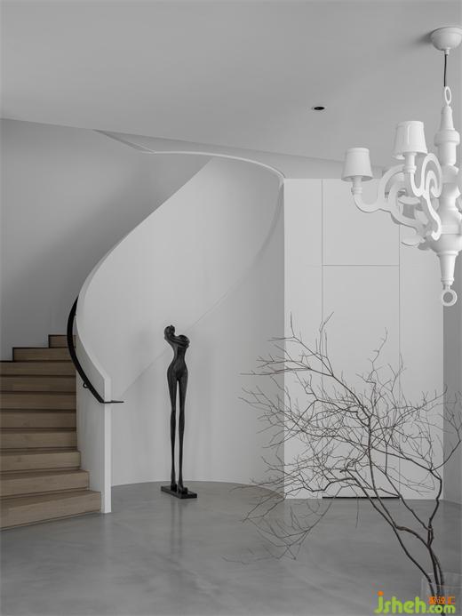 木制的旋轉(zhuǎn)樓梯和純白的墻面,裝飾以黑色的藝術雕塑和極具造型感的枝條,畫面干凈而高級。樓梯向上延伸,連通著整個家的安寧與溫暖。