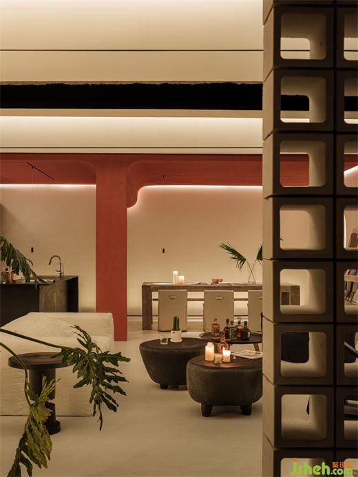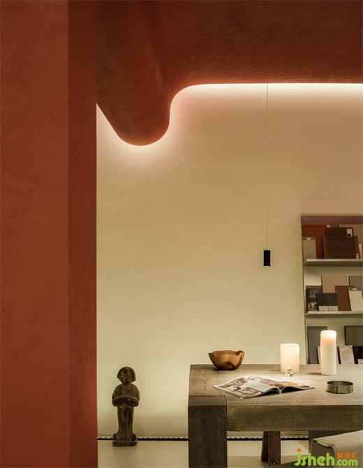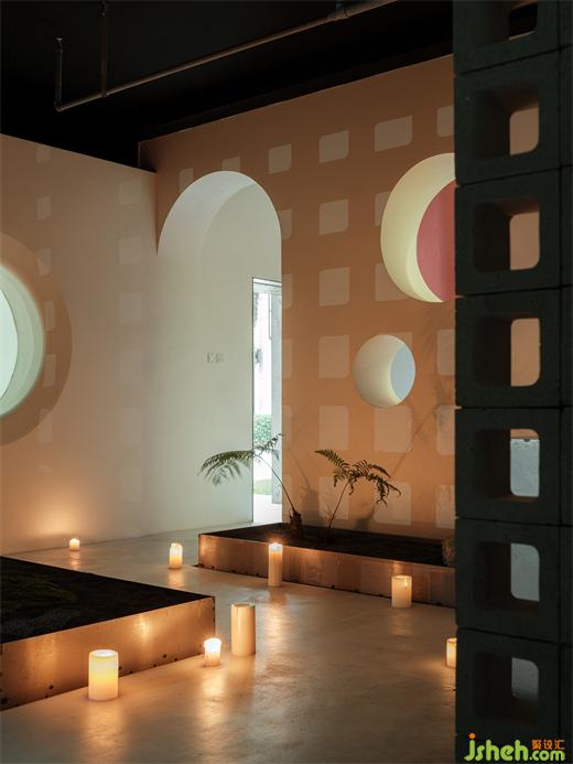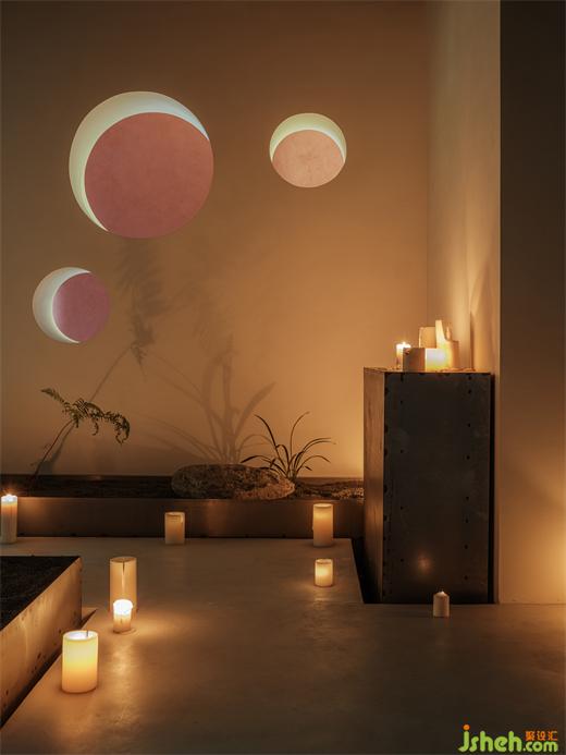 安靜的石頭和蘭草,靜靜沐浴著暖光,傳遞清新的自然山野氣息。上海辦公室設(shè)計(jì)內(nèi)部色彩與輪廓若隱若現(xiàn),極具空間層次與縱深感。緩步移動(dòng),搖曳的燭火安靜燃燒,仿佛承載愿望的燭燈浮于流水流向遠(yuǎn)方,燭光將影子投影在墻面,朦朧神秘,動(dòng)中有靜,既有自然的靈動(dòng)之氣,又充滿了虔誠(chéng)的儀式感。