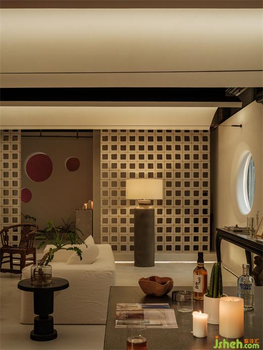 上海辦公室設(shè)計(jì)柔軟亞麻布面純白沙發(fā)與中式復(fù)古的扶手椅安靜對(duì)望,承載著歲月的沉靜與古樸。圓窗透出柔和而朦朧的暖光,給空間帶來私密性的同時(shí),仿佛給整個(gè)空間加上了柔光濾鏡,輕柔安寧。