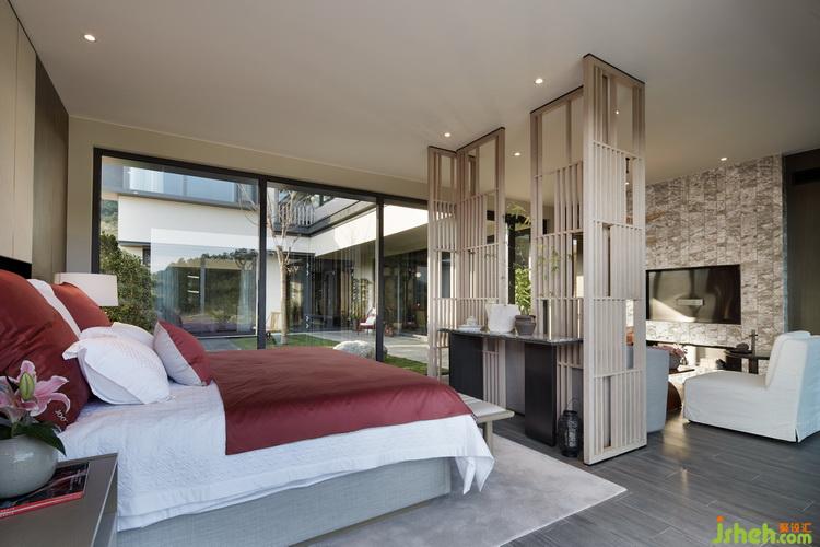遠(yuǎn)處的山景和近處的庭院將主人房相擁于自然之間,均衡對稱的木質(zhì)屏風(fēng),端莊大氣的床品,精致的案幾,室內(nèi)設(shè)計師以莊重的人文之禮,呈獻(xiàn)自然的慷慨賜予。動感時尚的金屬草帽燈和流線造型的茶幾,通過對比與轉(zhuǎn)換,重新解讀物料的本質(zhì),演繹與再造自然。