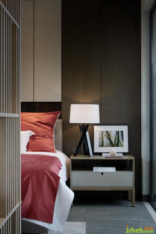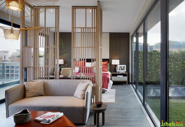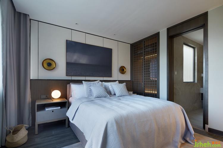 The distance mountain view and nearby courtyard embrace the master bedroom in nature. The balanced and symmetrical wooden screen, dignified bedding, exquisite casereveals thegenerous gift of nature with a solemn gift of humanity.Dynamicandfashion metal straw hat lamp and streamlined shape of the coffee table make are-interpretation of the nature of the material to interpret and recreatenature through the contrast and conversion.