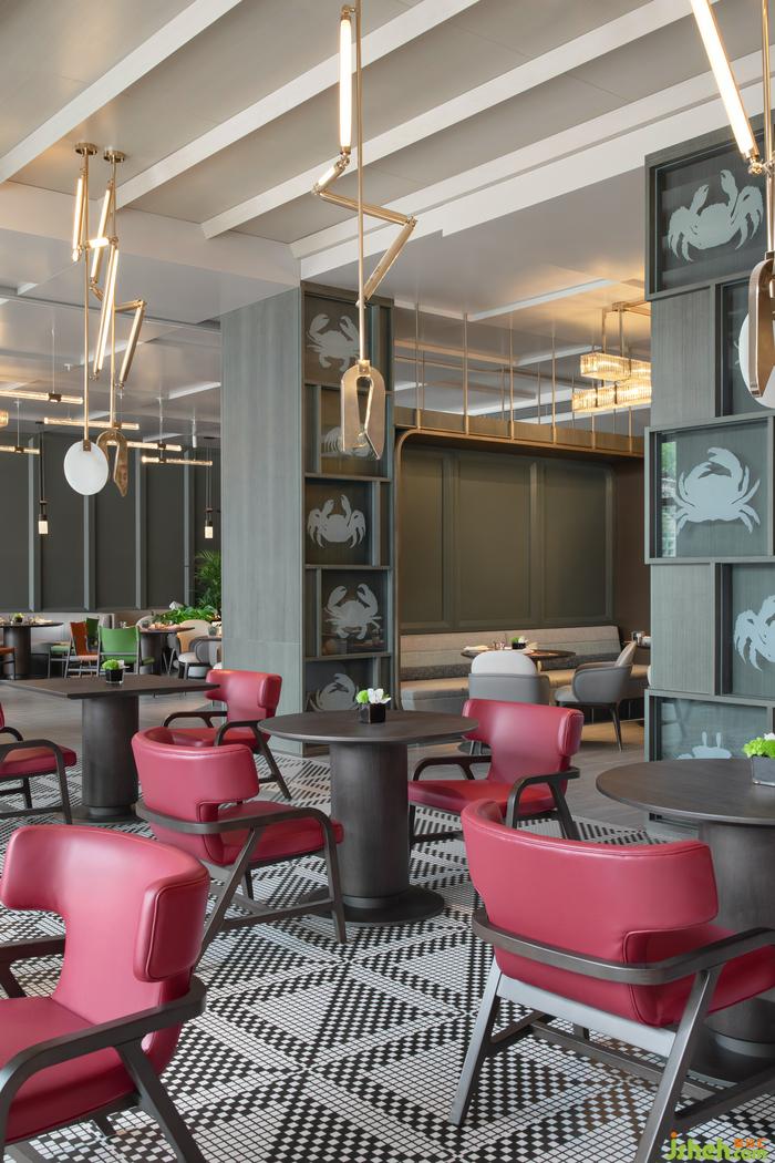 柔和造型的吧臺(tái)像湖邊并肩??康拇?,酒店設(shè)計(jì)以豐饒的蝦蟹食材為主題的特色屏風(fēng)、螃蟹造型的藝術(shù)玻璃相映成趣,一場(chǎng)邂(蟹)宴就此開(kāi)啟。