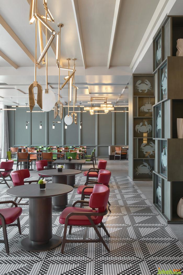 湖水緩緩蕩漾,舒緩的氛圍讓人拾獲寧靜。酒店設計以蟹腳為原型的燈飾,增添時尚趣味的空間調(diào)性。