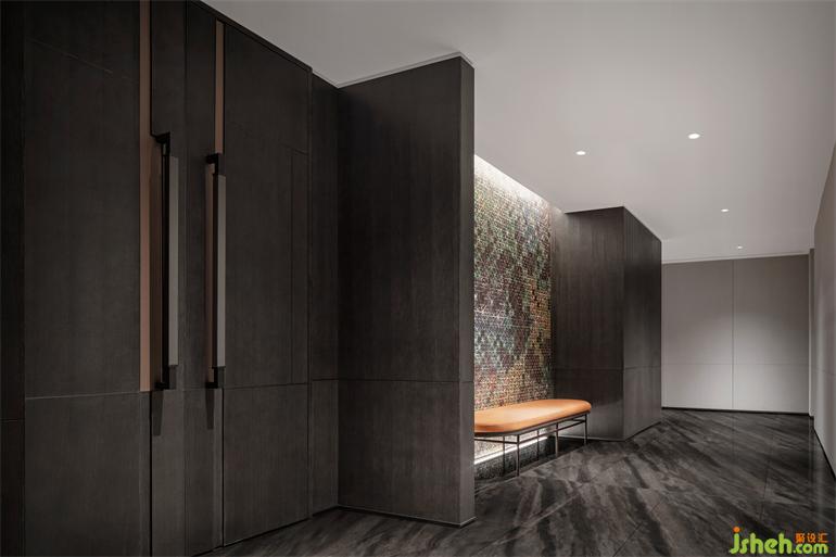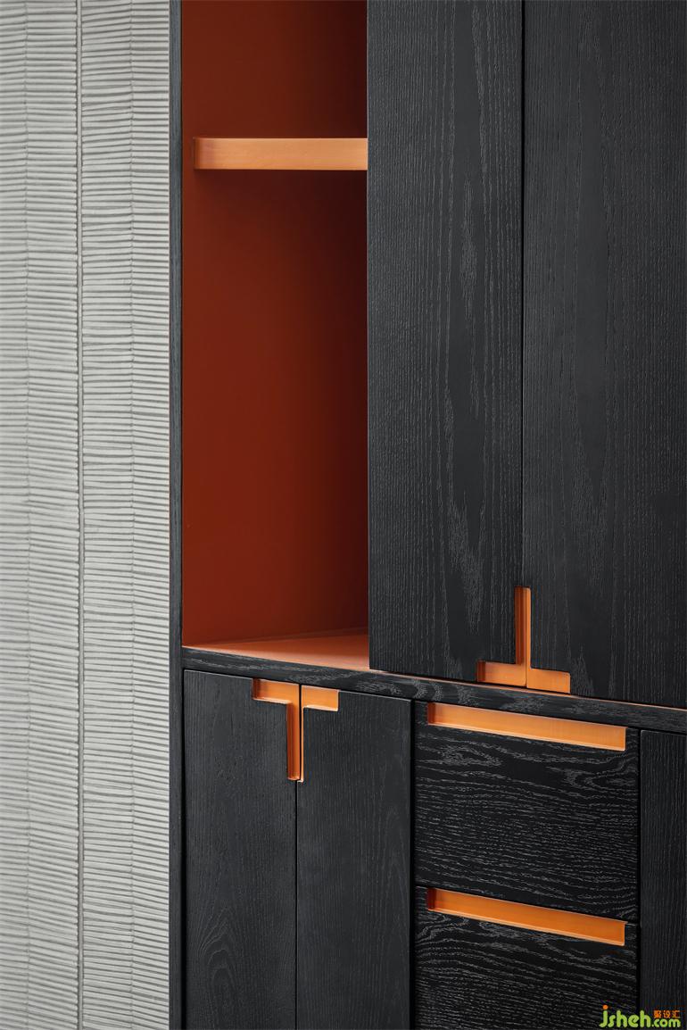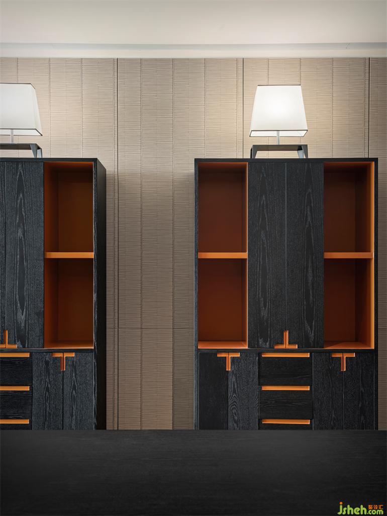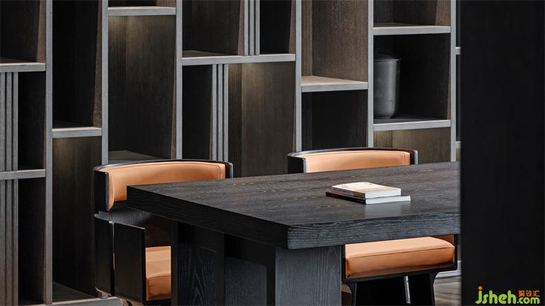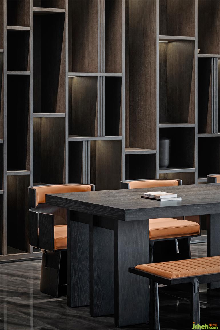 定制高柜以竹節(jié)為靈感,橙色烤漆木跳脫于黑色橡木之上,辦公會(huì)所設(shè)計(jì)豐富空間的戲劇化表達(dá)。獨(dú)特竹紋肌理壁紙,樸質(zhì)自然。