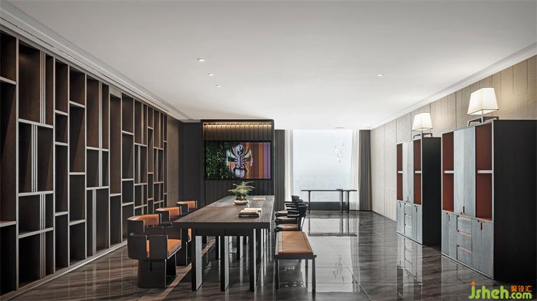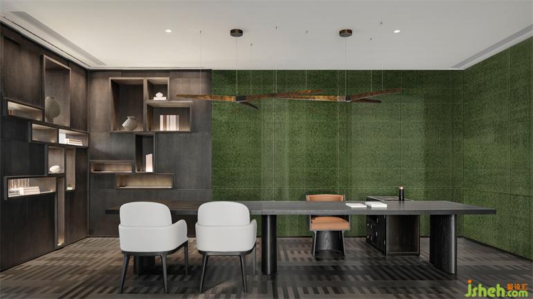 董事長(zhǎng)辦公室展現(xiàn)出更具包容度和生命力的空間內(nèi)涵。辦公會(huì)所設(shè)計(jì)樸拙的金屬吊燈平衡了實(shí)木、布藝溫潤(rùn)的質(zhì)感,看似對(duì)立的材質(zhì),于理性與感性間實(shí)現(xiàn)最佳平衡。