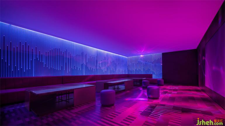 背景墻將“遠(yuǎn)山含黛入云煙“的自然美景濃縮于一墻之間。長短不一的水滴狀空心亞克力條,藉由頂部燈光的穿透,光影飄渺起伏。