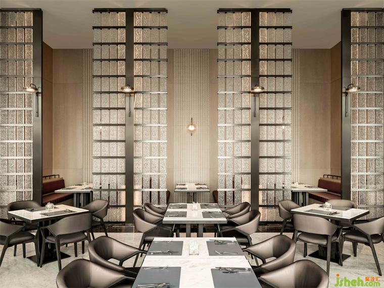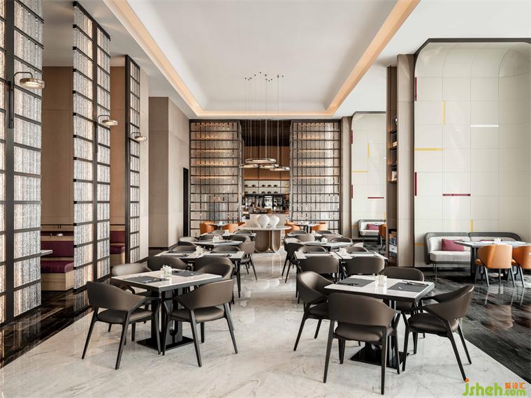 全日餐廳以簡(jiǎn)約的筆觸,勾勒無(wú)形的豐盈。時(shí)光彷彿于精妙的細(xì)節(jié)中交疊,從大堂延展至全日餐的陳列架、源自“街燈”形態(tài)的過(guò)道壁燈,軟包隔斷墻上似鱗次櫛比店招的錯(cuò)落亮麗色塊,于可視化的空間中映照出古商埠與新都會(huì)交融的圖景和故事。