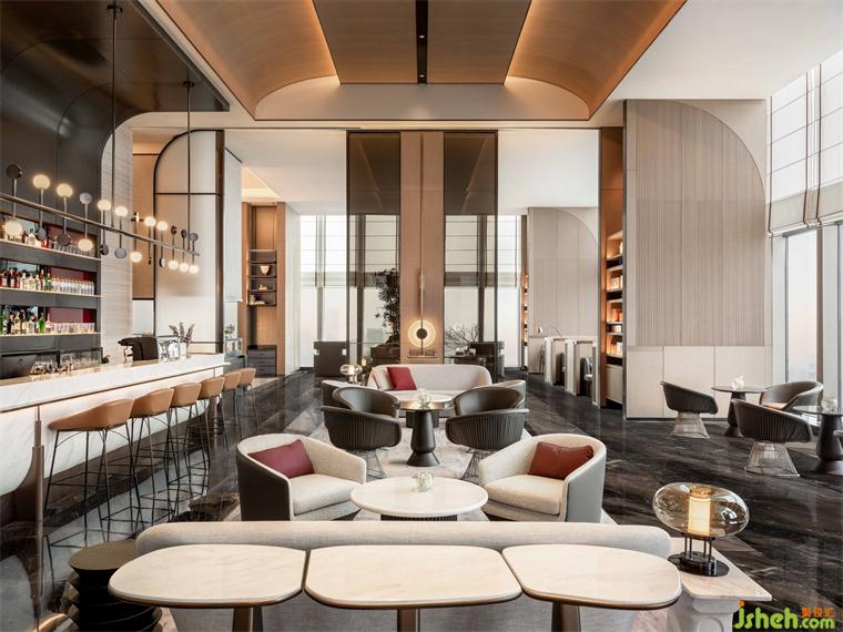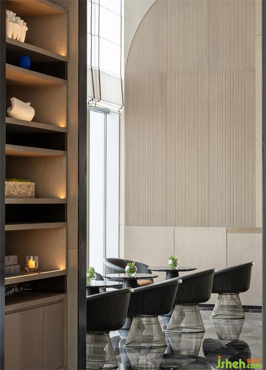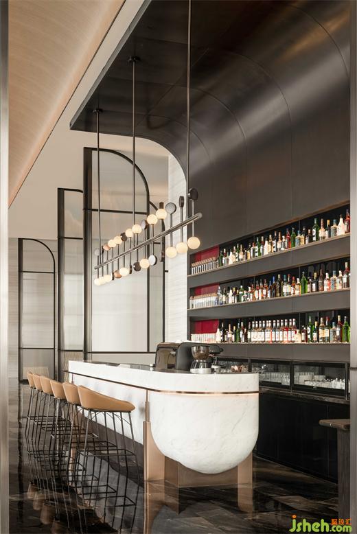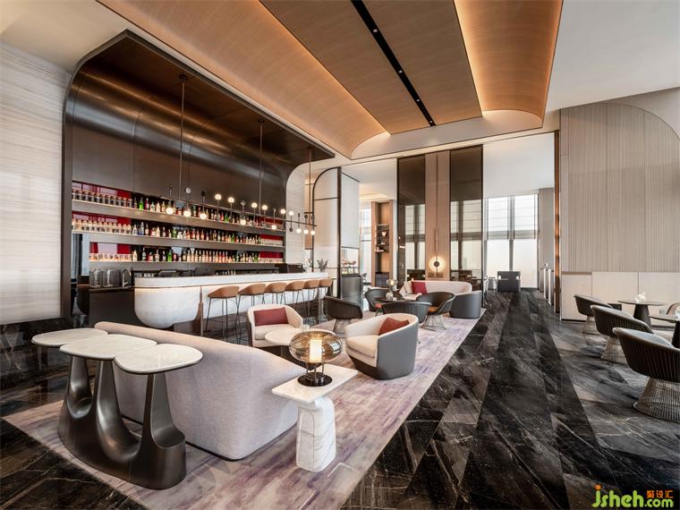 莫道江南遠(yuǎn),江南盡在此間。以江南烏篷船為靈感,酒店設(shè)計(jì)從地面延展至頂面的曲面吧臺(tái)背景墻,呼應(yīng)頂部天花造型,暖暖燈光傾瀉而出,予人一種暖心的包裹感。