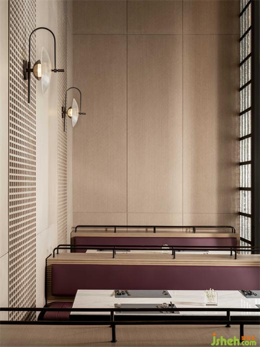 拉絲不銹鋼框架座椅與大理石邊桌訴諸理性、優(yōu)雅紫色地毯將感性拿捏。每個(gè)模塊都有著獨(dú)特而豐富的細(xì)節(jié),賦予大堂吧無(wú)限社交屬性。于此間,或與友人樂(lè),或遇見(jiàn)自己。
