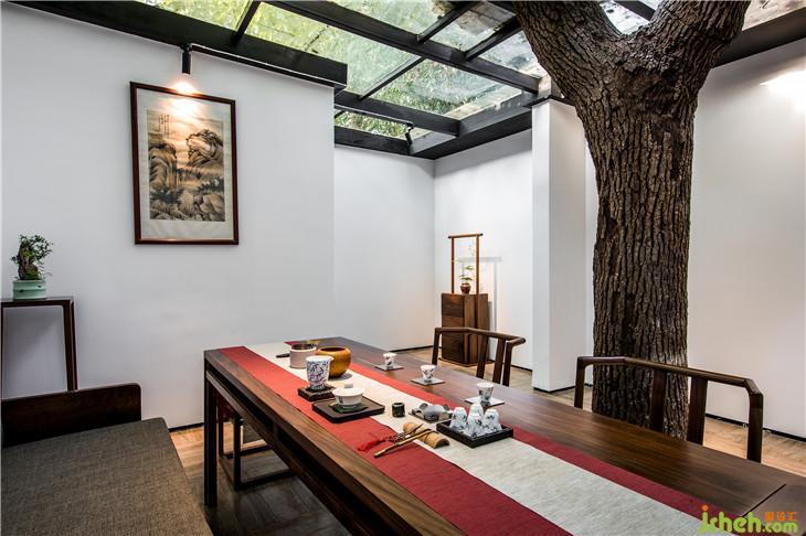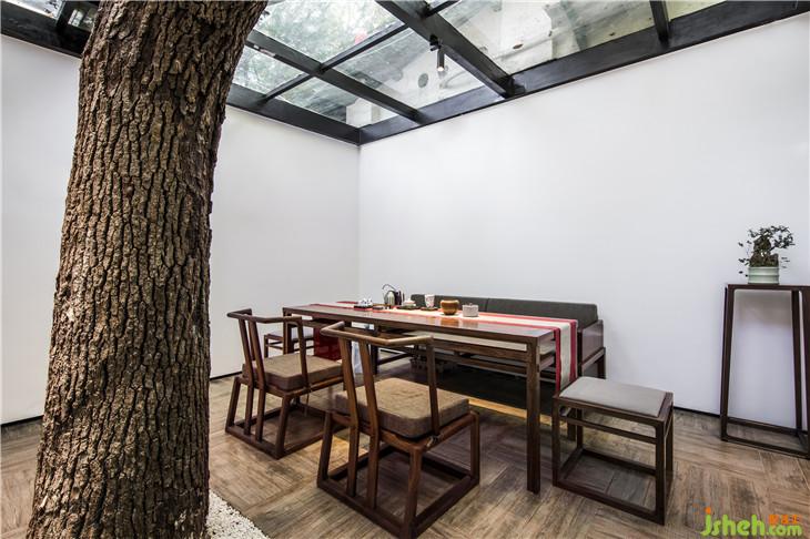 石板路的盡頭是另一處茶廂,留在空間里的大樹成為最入目的搭配,讓空間在自然的呼吸中煥發(fā)出強(qiáng)烈生機(jī)。