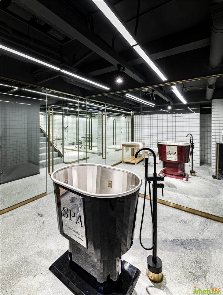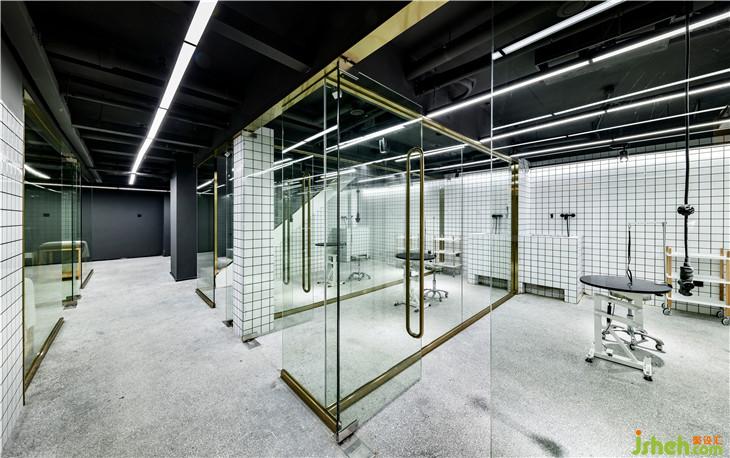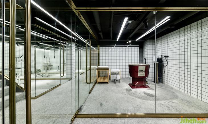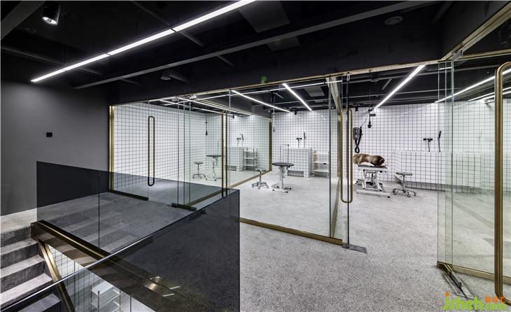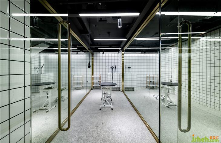 地下一層的洗寵區(qū)域,是“圍”與“透”的巧妙結(jié)合,透明的玻璃使整個(gè)空間既相對(duì)獨(dú)立,又完美契合。同時(shí),采用白色墻磚結(jié)合燈光效果,即使是地下空間也最大程度的保留了明亮感與通透感。