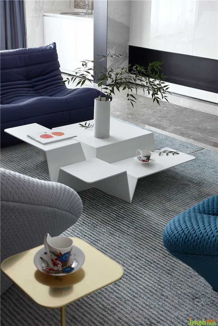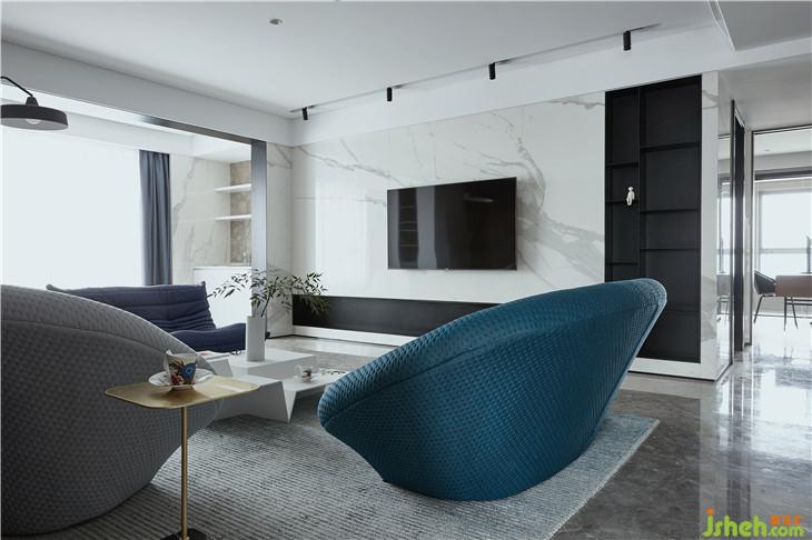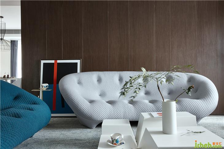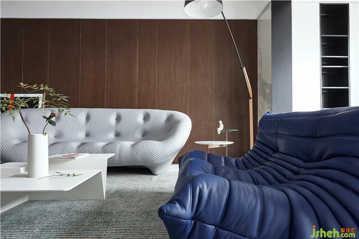 在客廳,寧?kù)o深灰藍(lán)與低雅灰的組合就像是靜謐的海面上,薄霧裊裊,詩(shī)意無限。而亮白色的加入,仿若一線天際之間天光乍破,于平靜之中內(nèi)斂著無限生機(jī)與力量。