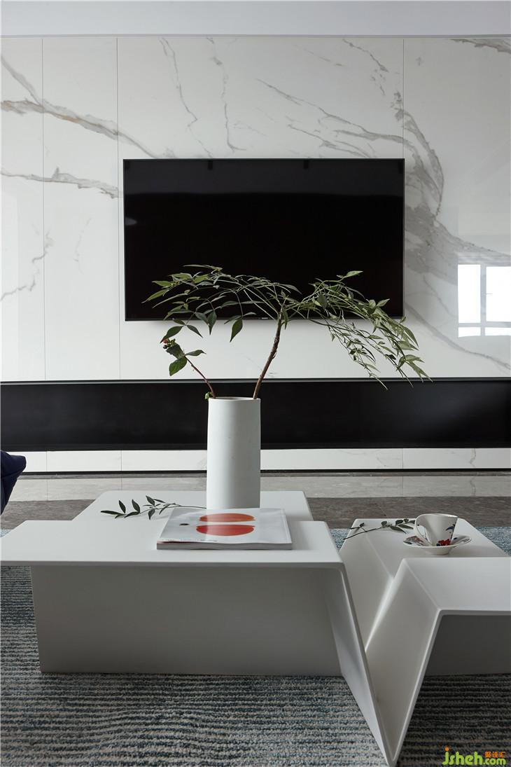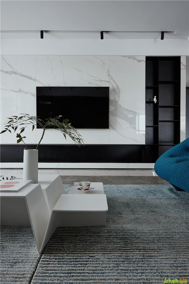 選材上,更多地以空間的冷暖平衡為出發(fā)點(diǎn),而大理石和木飾面正是天平的兩端。木飾面素雅的色澤配搭著藍(lán)白的清雅,再以綠植添色,為空間帶來了春天般溫潤(rùn)鮮活的氣息。