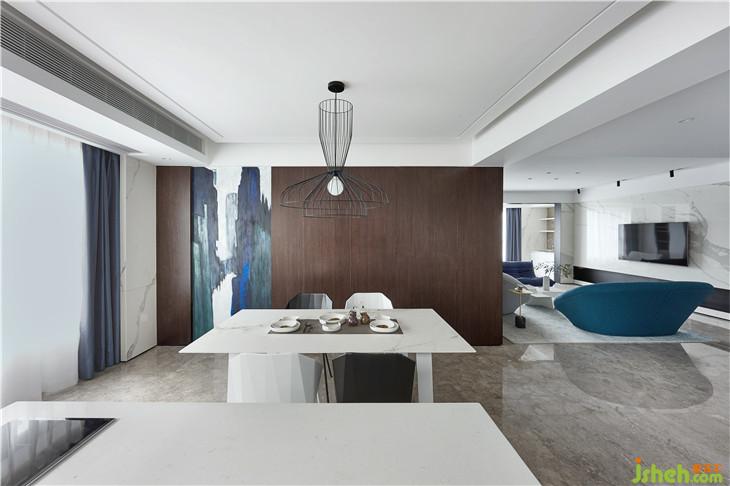 餐廳延續(xù)客廳時(shí)尚輕奢的基調(diào),在色彩上,大面積的白,更加放大了深灰藍(lán)的寧?kù)o氣質(zhì),讓空間如潔白的云朵般輕盈,以足夠的包容去承載居者生活中的眾多美妙時(shí)刻。