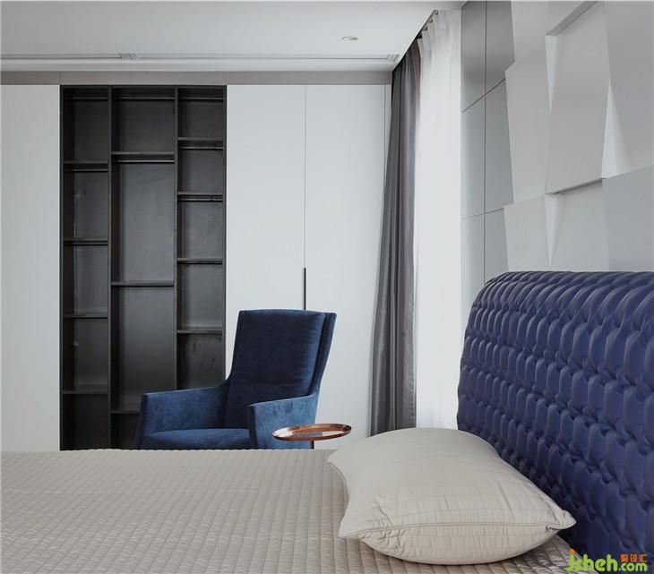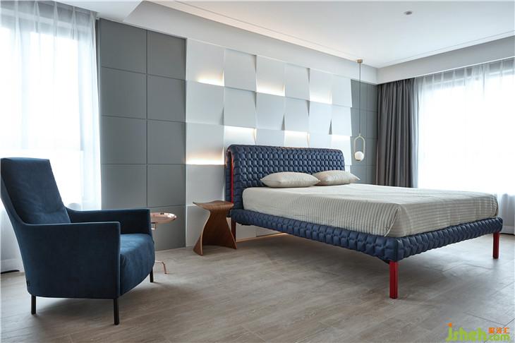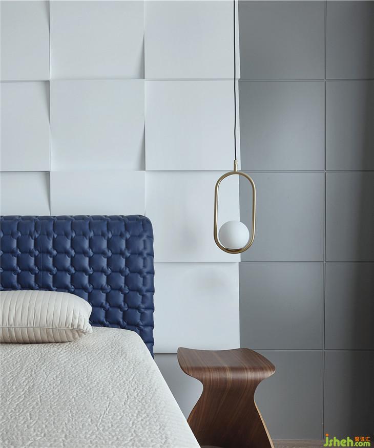 同樣的色彩組合在臥室呈現(xiàn)出沉靜洗練的質(zhì)感體驗(yàn)。多面飄窗,讓居者、空間與光無(wú)阻礙對(duì)話。極簡(jiǎn)燈飾的不對(duì)稱(chēng)搭配,獨(dú)特造型的背景墻,打破了空間的單調(diào)感,動(dòng)靜之間的微妙平衡將空間品質(zhì)彰顯的淋漓盡致。