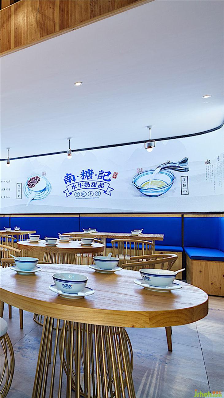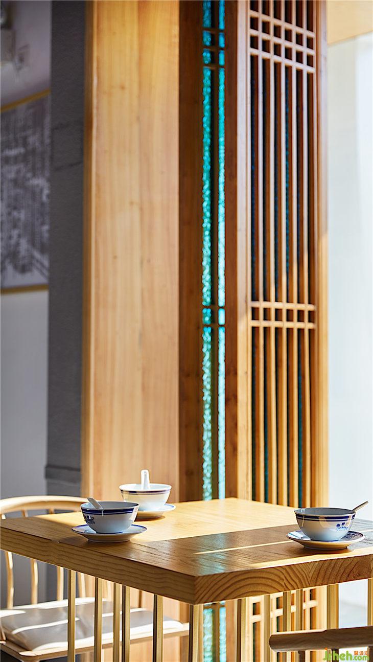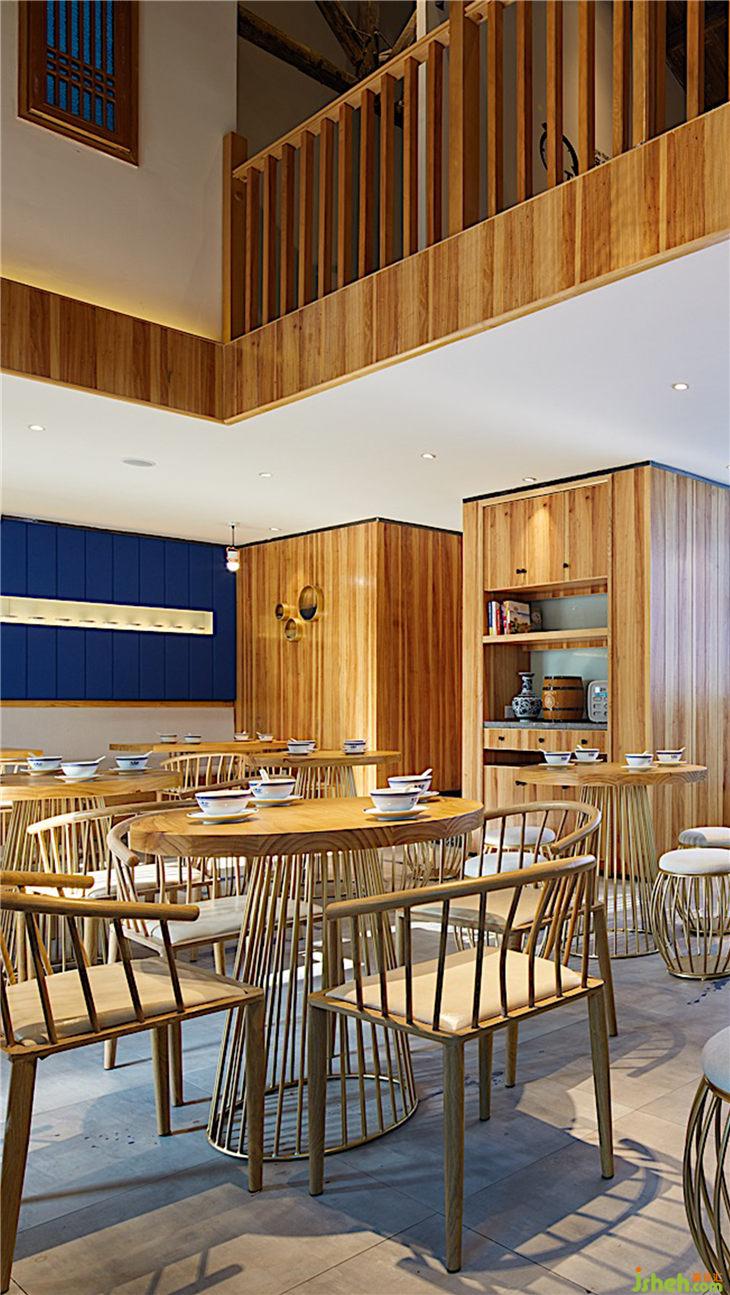 主材名稱:老榆木、壓花玻璃、槽鋼、鐵板、白色氟碳漆、榆木飾面板、藍(lán)色麻布硬包、藍(lán)色水墨仿古地磚