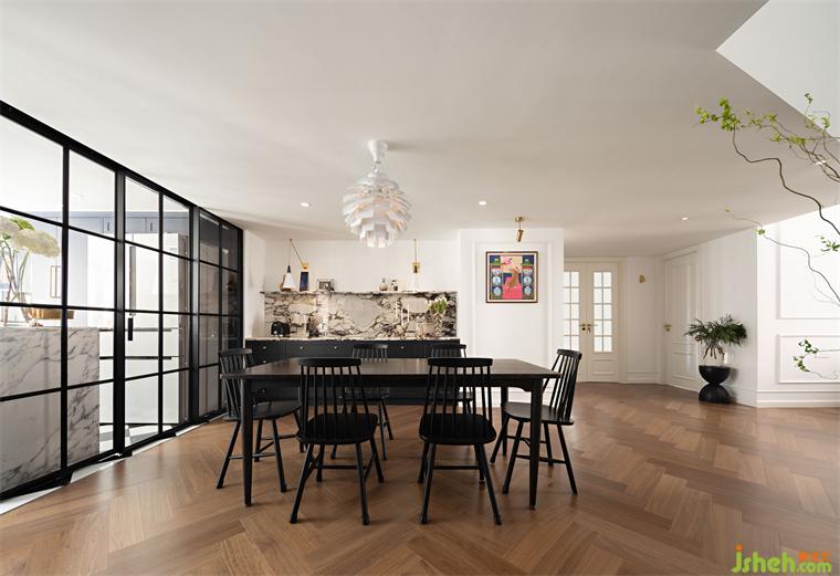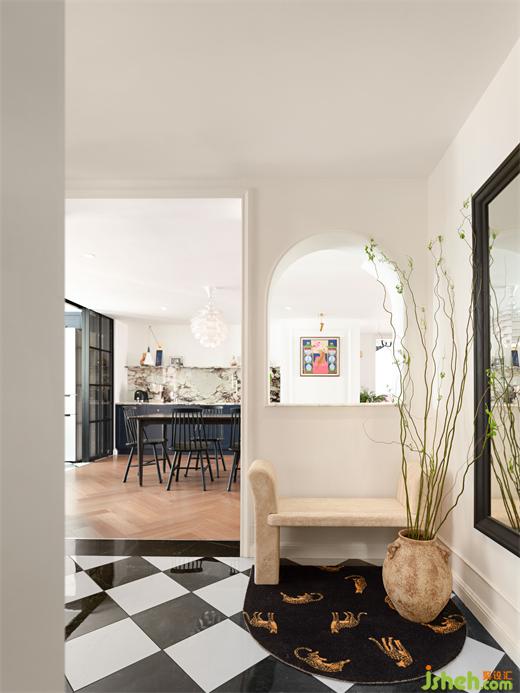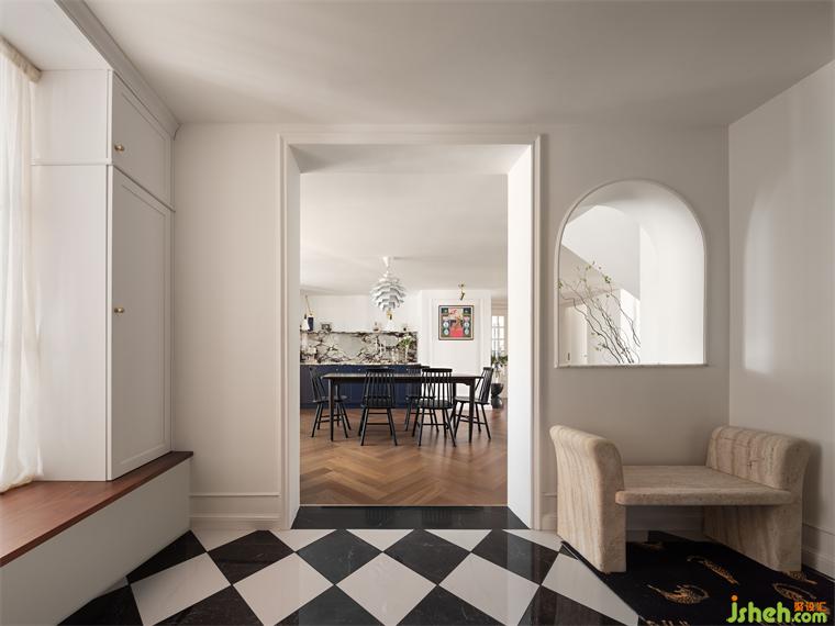 于是從對(duì)于光與空間的感受入手,廣州復(fù)式設(shè)計(jì)通過空間連通嘗試讓玄關(guān)變得通透,左側(cè)墻體做成玻璃窗格采光,加上正面的墻洞形成了前框后景的設(shè)計(jì)。相信流通的空氣與光線足夠活躍心情,裝修設(shè)計(jì)將進(jìn)入者在空間高度方面的注意力轉(zhuǎn)移到四周,建立視覺引導(dǎo)。另外在玄關(guān)左側(cè)窗格也設(shè)計(jì)了隱藏的鞋柜,成為兼顧美感與實(shí)用的一個(gè)空間。