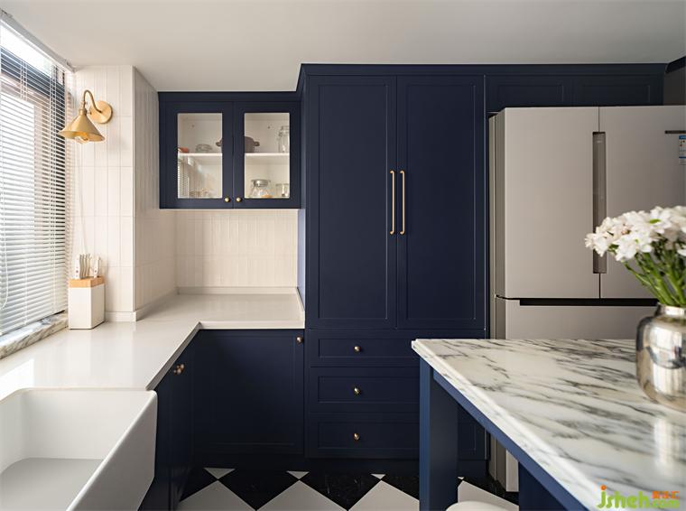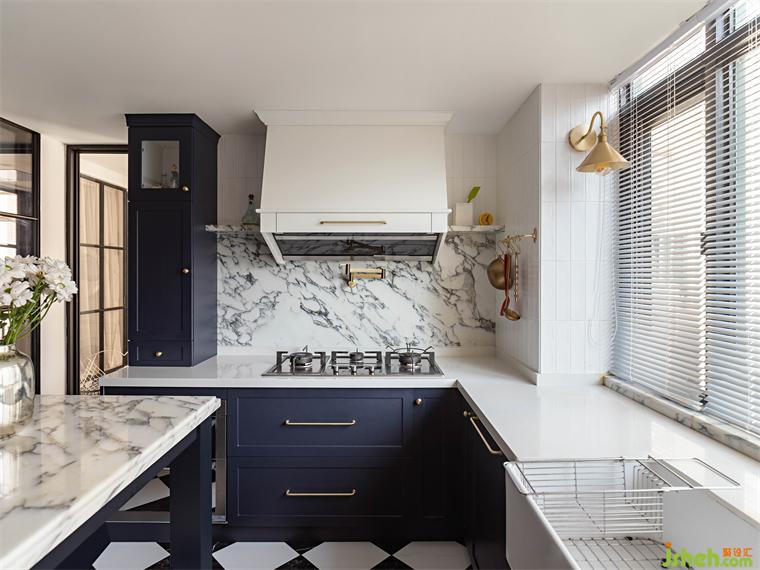 廚房的改造是令業(yè)主尤為驚喜的,我們用掉了原先一整個(gè)房間的面積作為廚房使用,它與餐廳在視覺上保持交互,是一個(gè)可開合的半開放式空間,內(nèi)部以一個(gè)中島臺(tái)為中心,四周建立廚房的各項(xiàng)功能,廣州復(fù)式設(shè)計(jì)深色的櫥柜搭配淺色的雪花白大理石,有著不言而喻的優(yōu)雅氣質(zhì)。而原有的大窗戶也成就了這個(gè)陽光充沛的廚房,在陽光中烹飪的愜意,再加上那落日玫瑰吊燈、量身定做的煙機(jī)罩、爐上龍頭,這些元素讓人不禁有做一頓美食的沖動(dòng),共赴視覺盛宴。