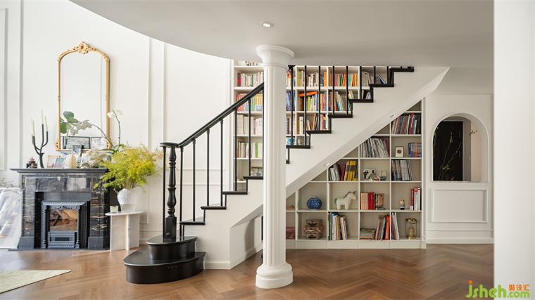 基于業(yè)主巨量藏書的要求,我們?cè)O(shè)計(jì)了貫通一二樓的整面書架墻,書架旁的直樓梯既是上下之用,也常被大小男主人用作閱讀坐處,符合他們關(guān)于隨處閱讀的美好想象。裝修設(shè)計(jì)樓梯一樓扶手設(shè)計(jì)的蝸牛彎、第一二級(jí)階梯做成的弧形、形成側(cè)向的轉(zhuǎn)向,處處蘊(yùn)含法式細(xì)節(jié),也響應(yīng)了樓梯在風(fēng)水方面的要求。另外把樓梯做深,更能體現(xiàn)書的立體感和存在感,樓板支撐柱則采用羅馬柱的形式進(jìn)行了包裹裝飾。