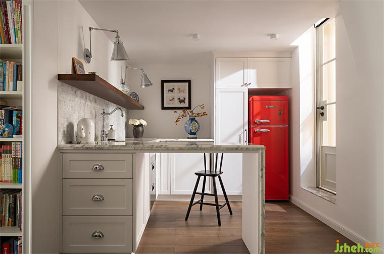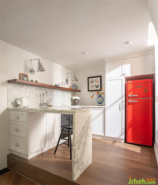 這里最為點(diǎn)亮空間的便是紅色的復(fù)古冰箱,讓人的視覺情不自禁被它吸引,廣州復(fù)式設(shè)計(jì)在素色的櫥柜中給予一抹熱情的點(diǎn)綴。櫥柜部分則繼續(xù)沿用了樓下的雪花白大理石元素,臺(tái)上的裝飾,讓人更多的感受到這是一個(gè)放松的空間。