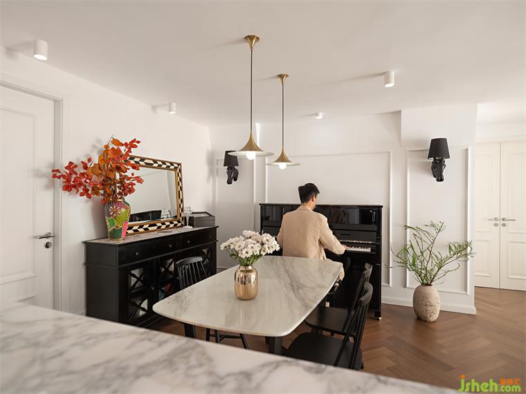 活動(dòng)區(qū)的墻面為了應(yīng)襯鋼琴演奏的氛圍感,加了一圈簡單的線條,搭配有黑色的馬頭壁燈,以及法式元素的壁畫和邊柜。