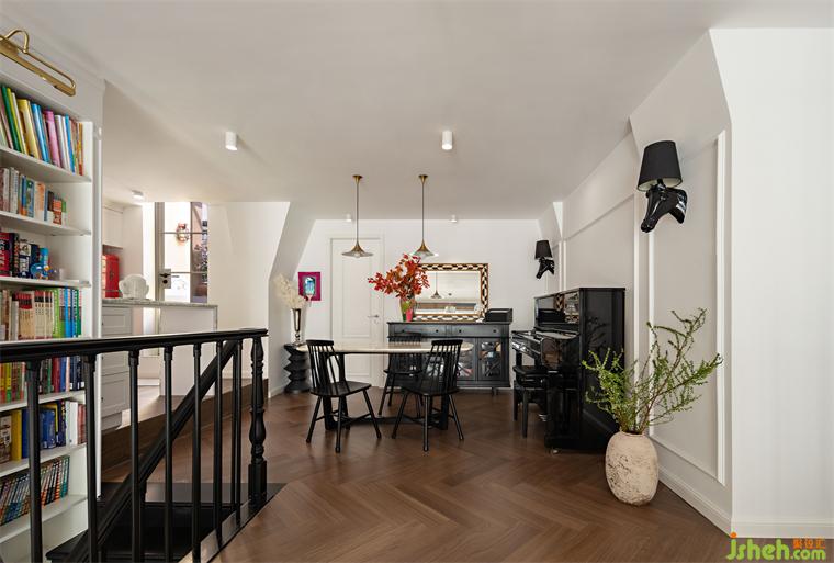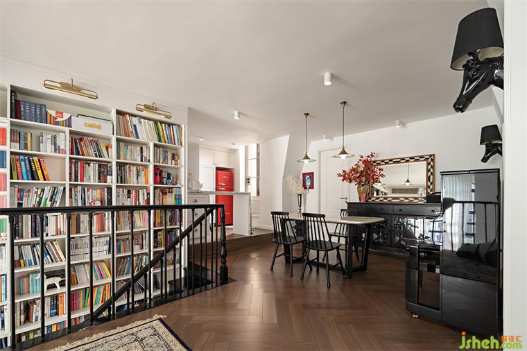書房設(shè)置在二樓樓梯口的位置,結(jié)合旁邊樓梯中空位置的書墻,形成這套房子非常標(biāo)識(shí)性的一個(gè)開放式書房,更多的是父母為小孩輔導(dǎo)作業(yè)的功能,滿滿的圖書館氛圍感。