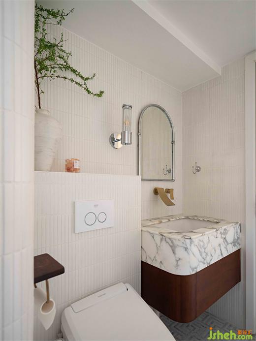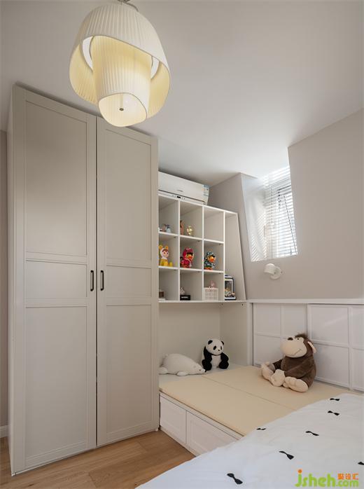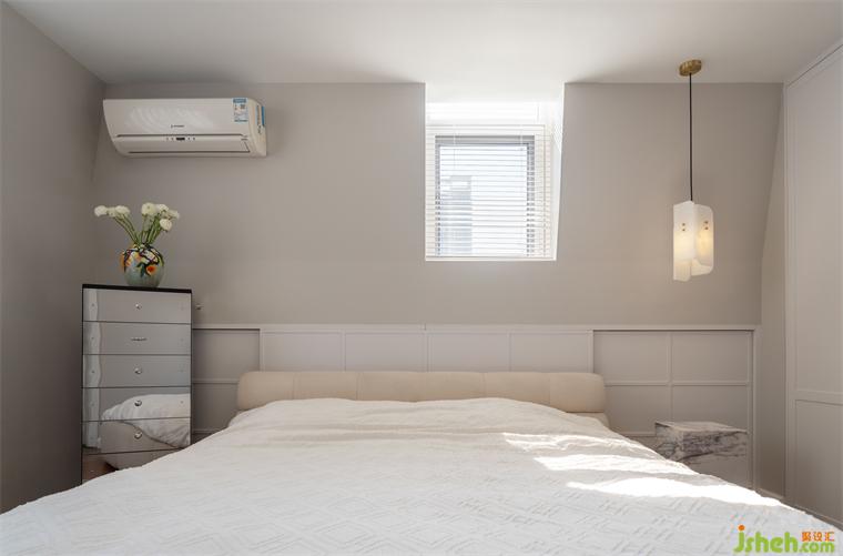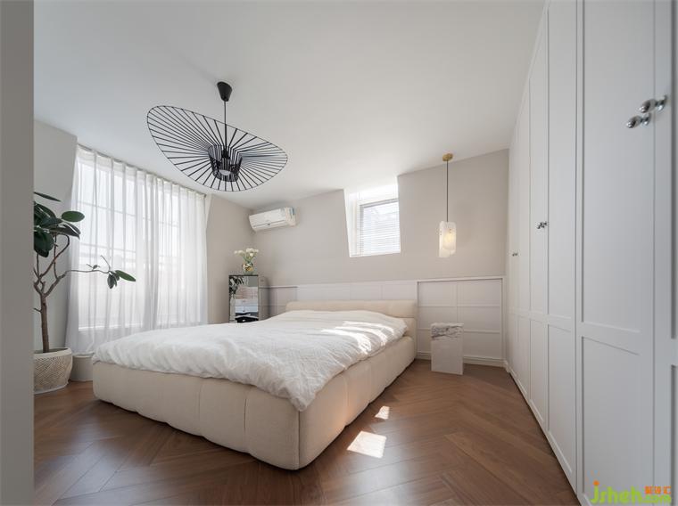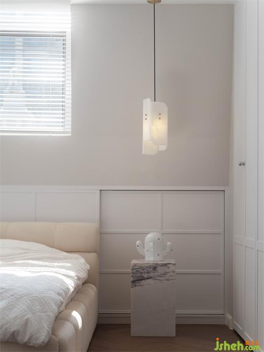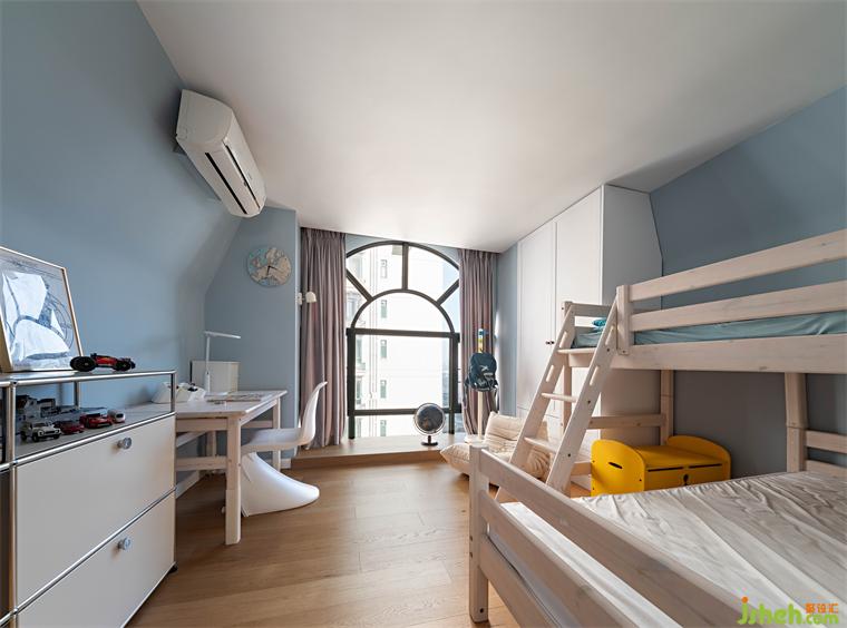 主臥通過儀式感十足的雙開門,進(jìn)入房尺度恰好的主臥空間,哥特式的頂窗,形成天然的船頭背景,搭配上卷葉吊燈,毛絨床的質(zhì)感,讓進(jìn)去的人第一感受就是無(wú)比的放松。門后是連排的隱藏式衣帽間,步入式設(shè)計(jì),讓它與衣柜融為一體。