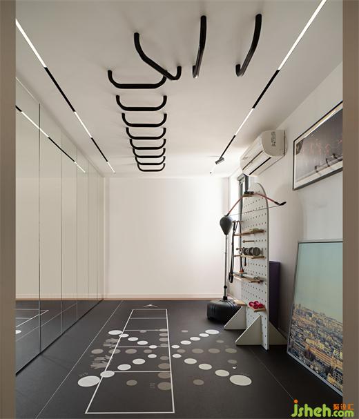 一樓的功能房同時(shí)也用作健身區(qū)域,牢牢焊接的攀爬架、連排的平面鏡柜、訂做的健身專用地板膠、自定義器材架等等,展示了多姿多彩的活動(dòng)可能。